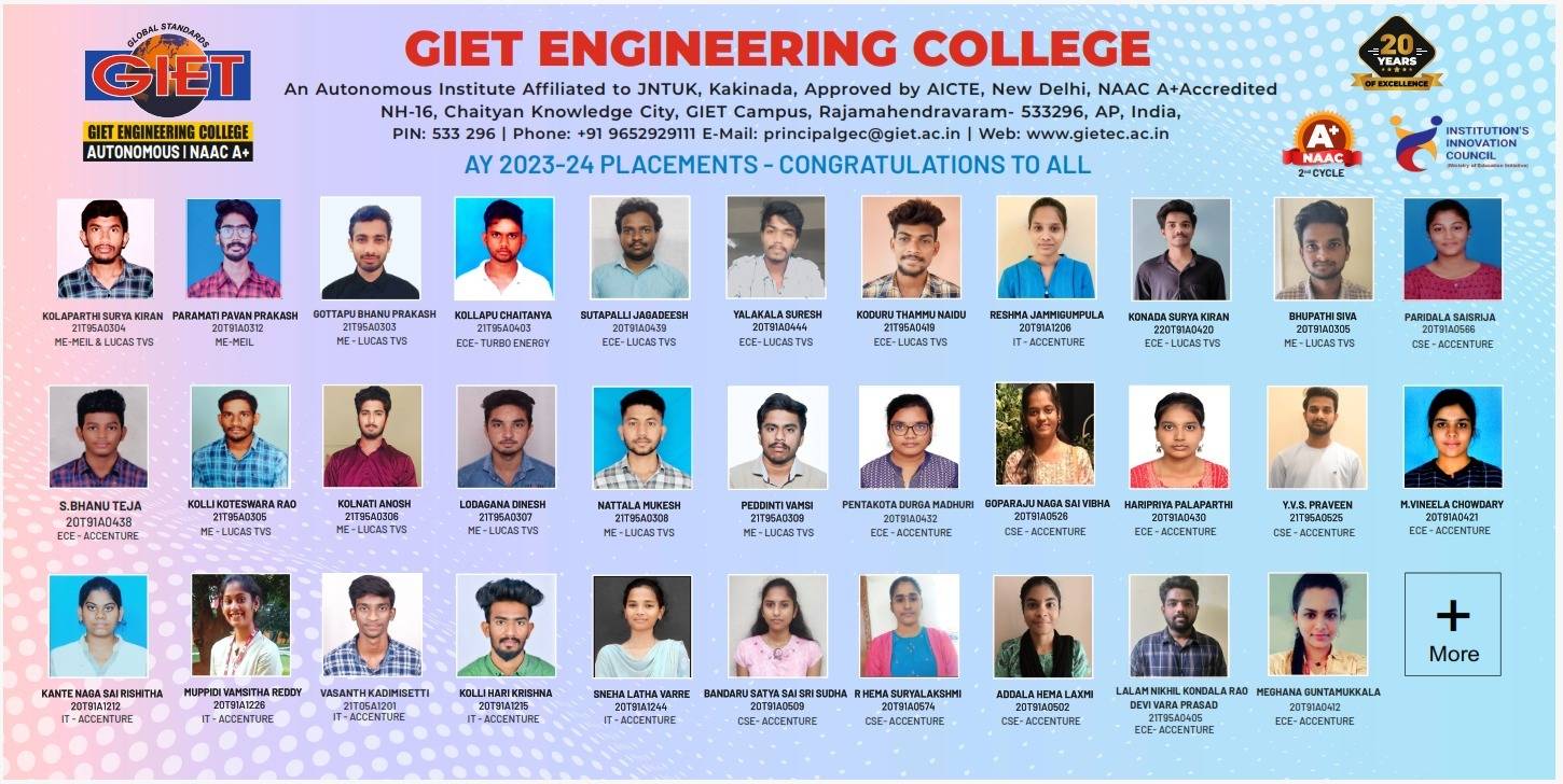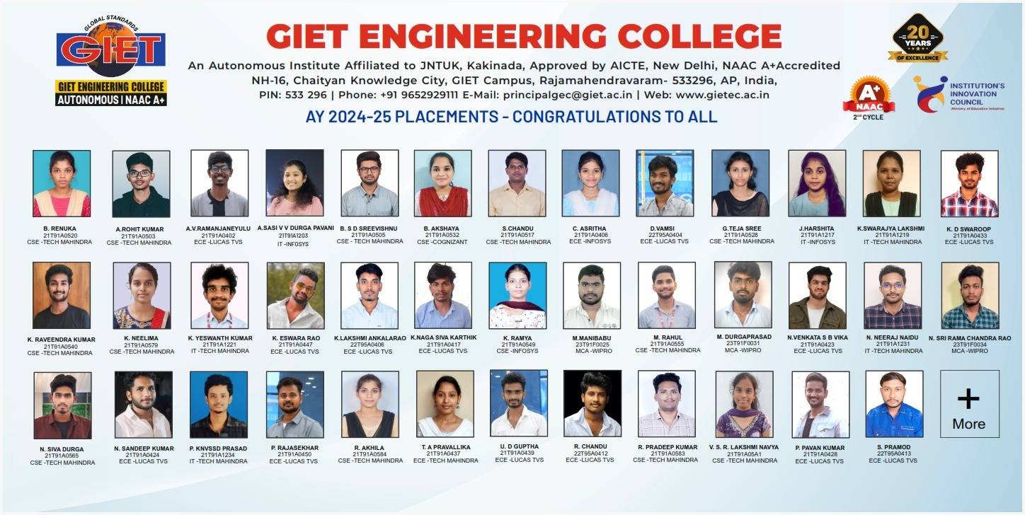 Located at Chaitanya Nagar on NH-16 on the outskirts of Rajahmundry adjoining the GIET campus, GIET Engineering College is an epitome of excellence in every aspect. Approves by AICTE and affiliated to JNT University Kakinada (JNTUK), the institute offers undergraduate programs in diverse engineering streams.